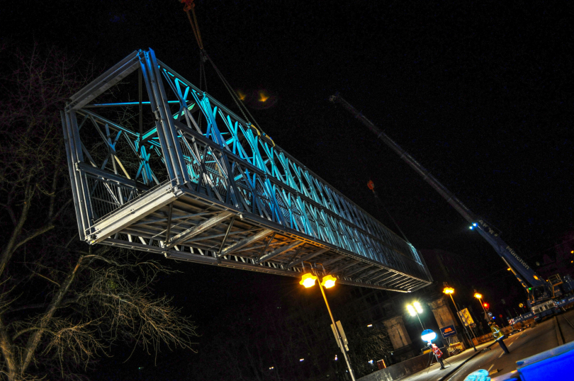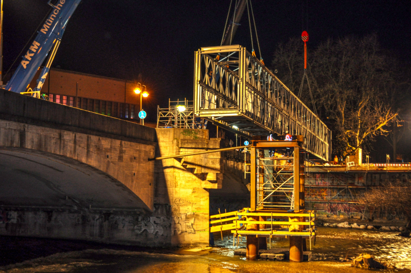 Während der Bauzeit werden die auf den Ludwigsbrücken verlaufenden Geh- und Radwege auf insgesamt sechs Behelfsbrücken umverlegt, die südlich und nördlich der Bestandsbauwerke angeordnet sind. Zwischen dem 22.03. und dem 29.03.2020 wurden diese sechs Behelfsbrücken jeweils in Nachtschichten in Einzelteilen antransportiert, montiert und erfolgreich eingehoben. Für den Einhub der über 60 Tonnen schweren und ca. 50 m langen Behelfsbrücken kamen zwei leistungsfähige Mobilkräne mit Hubkapazitäten von bis zu 450 Tonnen zum Einsatz.