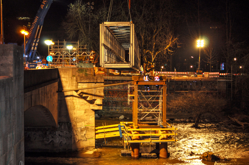 zu 450 Tonnen kamen Ende März 2020 zum Einsatz, als zur Generalinstandsetzung der Inneren und Äußeren Ludwigsbrücke in München sechs über 60 Tonnen schwere und ca. 50 m lange Behelfsbrücken antransportiert, montiert und erfolgreich eingehoben wurden. Sehen Sie hier ein neues Video der Instandsetzung, das uns das Baureferat der Stadt München zur Verfügung gestellt hat.