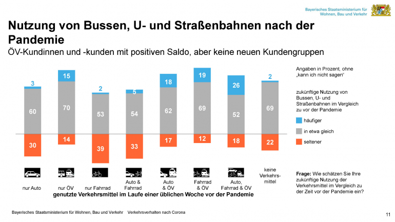 Die Studie belegt: Durch die Pandemie hat sich die Mobilität der Befragten unabhängig vom Verkehrsmittel insgesamt verringert, da viele Wege weggefallen sind. Den Öffentlichen Personennahverkehr (ÖPNV) hat laut Studie etwa ein Drittel (32 - 35%) der Befragten weniger genutzt, bei den Stammkunden ist es ein Minus von rund der Hälfte (43 – 64%).