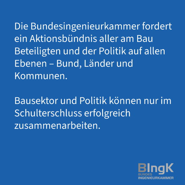 Die Bundesingenieurkammer fordert hierfür ein Aktionsbündnis aller am Bau Beteiligten und der Politik auf allen Ebenen – Bund, Länder und Kommunen. Bausektor und Politik können nur im Schulterschluss erfolgreich zusammenarbeiten. Partikularinteressen einzelner Marktteilnehmer nachzugeben ist nicht zielführend, da dies langfristig den gesunden Markt und den Wettbewerb im Bausektor gefährdet.