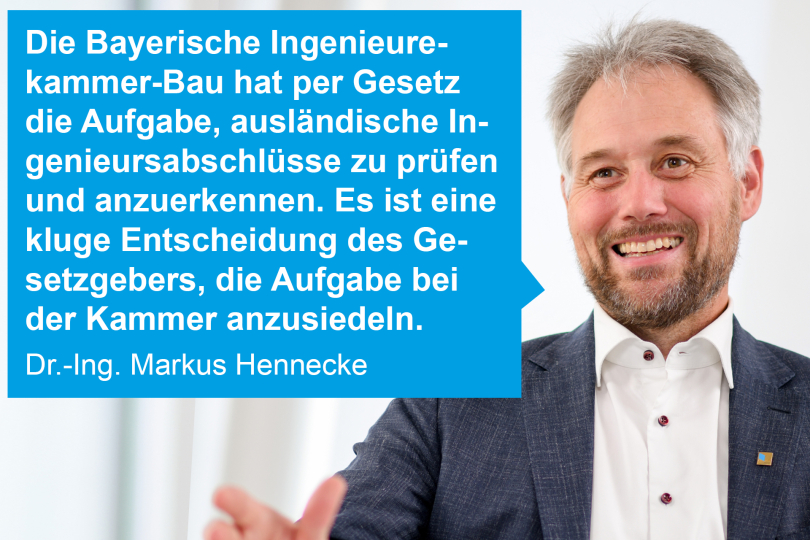 Die Bayerische Ingenieurekammer-Bau hat per Gesetz die Aufgabe, ausländische Ingenieursabschlüsse zu prüfen und anzuerkennen (Berufsanerkennung). Es ist eine kluge Entscheidung des Gesetzgebers, die Aufgabe bei der Kammer anzusiedeln. Die berufsständische Vertretung der am Bau beteiligten Ingenieure hat die besten Kompetenzen hierfür.