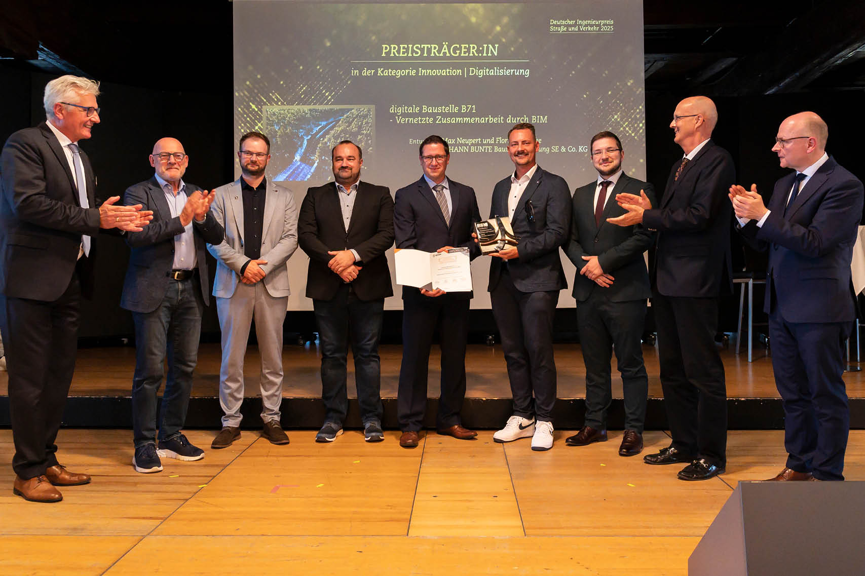 Den Deutschen Ingenieurpreis Straße und Verkehr 2025 in der Kategorie INNOVATION / DIGITALISIERUNG erhält die Papenburger JOHANN BUNTE Bauunternehmung SE & Co. KG für das BIM-Pilotprojekt (Building Information Modeling) Letzlingen. Im Rahmen einer 5-monatigen Erhaltungsmaßnahme auf 5,5 km der B71 wurde ein umfassendes BIM-Pilotprojekt realisiert. Die Jury überzeugt der umfassende, digitalisierte Projektansatz mit der Erstellung und Fortschreibung von Bauwerksmodellen über alle Projektphasen hinweg – von der ersten Planungsidee, Bauausführung und Betriebsphase bis zum späteren Rückbau. Zentrale Leistungen sind u.a. Bauablaufsimulationen, digitale Mengenermittlung und Abrechnung sowie die Erstellung eines „wie-gebaut“-Modells. Punktwolken, Drohnen und koordinierte Projektprozesse über eine zentrale Datenumgebung ermöglichen eine präzise Fortschrittsdokumentation. Das Projekt demonstriert das Potenzial von BIM, künftig auch mit geringeren Fachpersonal-Ressourcen die Effizienz, Transparenz und Qualität im Straßen-bau weiter zu steigern.