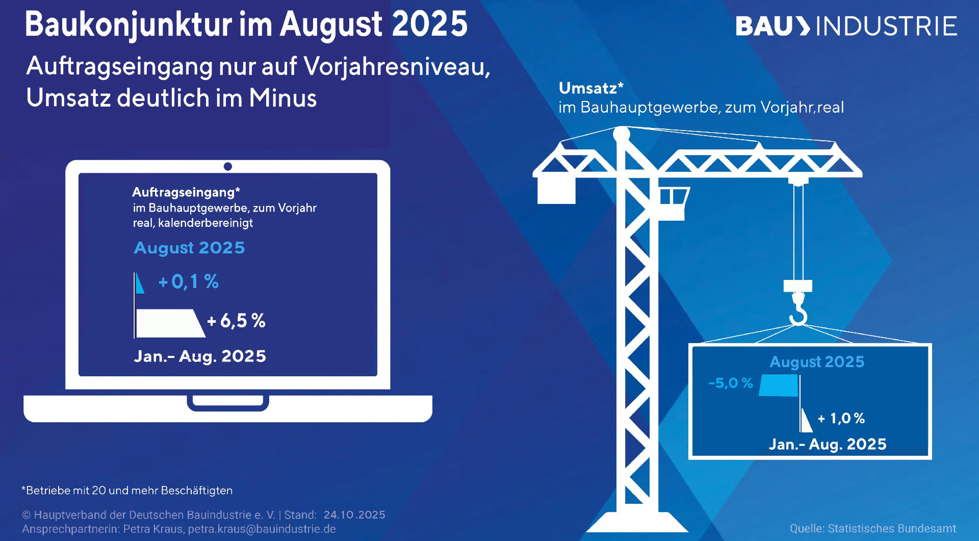 „Die positive Entwicklung beim Auftragseingang im Juli hat sich im August leider nicht fortgesetzt. Dass es nicht zu einem Einbruch kam, ist lediglich einigen Großprojekten; insbesondere im gewerblichen Hochbau und Brückenbau zu verdanken. Diese haben den Rückgang im Wirtschaftstiefbau, im Straßenbau und im Wohnungsbau ausgeglichen. Allerdings konnten nicht alle Bundesländer von der Entwicklung profitieren, die regionalen Ordereingänge fielen sehr unterschiedlich aus.“ Mit diesen Worten kommentiert der Hauptgeschäftsführer der Bauindustrie, Tim-Oliver Müller, die am 24.10.2025 veröffentlichten Konjunkturindikatoren für den Bau.