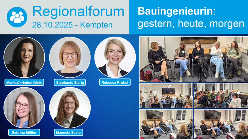 Der Ausschuss „Leben | Arbeit | Karriere“ der Bayerischen Ingenieurekammer-Bau hat mit "Bauingenieurin: Gestern, heute, morgen“ eine Veranstaltungsreihe zum Austausch unter Kolleginnen und Kollegen aller Disziplinen ins Leben gerufen. Das letzte Regionalforum fand am 28. Oktober 2025 in Kempten statt. Die Teilnahme war kostenfrei!