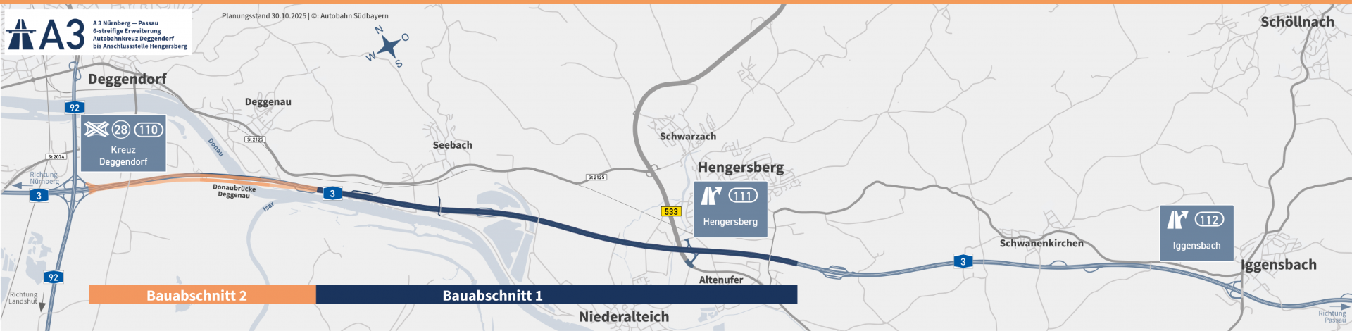 An der A3 zwischen dem Kreuz Deggendorf und der Anschlussstelle Hengersberg laufen derzeit die bauvorbereitenden Maßnahmen für den geplanten sechsstreifigen Ausbau auf Hochtouren. Bundesverkehrsminister Patrick Schnieder besuchte am 30. Oktober 2025 gemeinsam mit dem bayerischen Verkehrsminister Christian Bernreiter und dem Technischen Geschäftsführer der Autobahn GmbH, Dirk Brandenburger, die Baustelle, um sich ein Bild vom Fortschritt der Arbeiten zu machen.