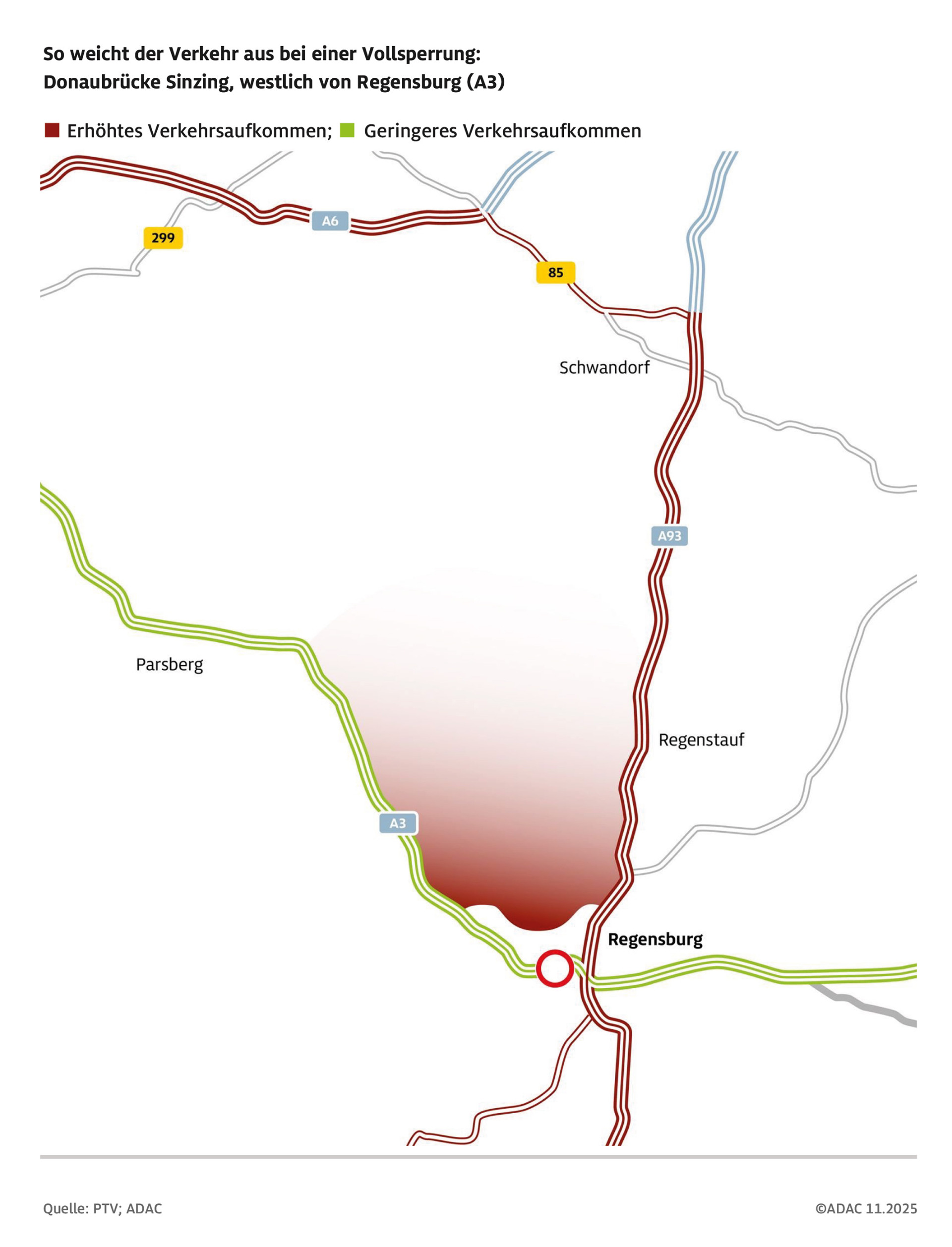 Die Analyse zeigt: Schon eine temporäre Sperrung der Brücke würde Verkehrsverlagerungen über weite Teile des bayerischen Autobahnnetzes nach sich ziehen – etwa auf die A6 oder A93. Die Folge: Umwege, Staus und deutlich längere Fahrzeiten.