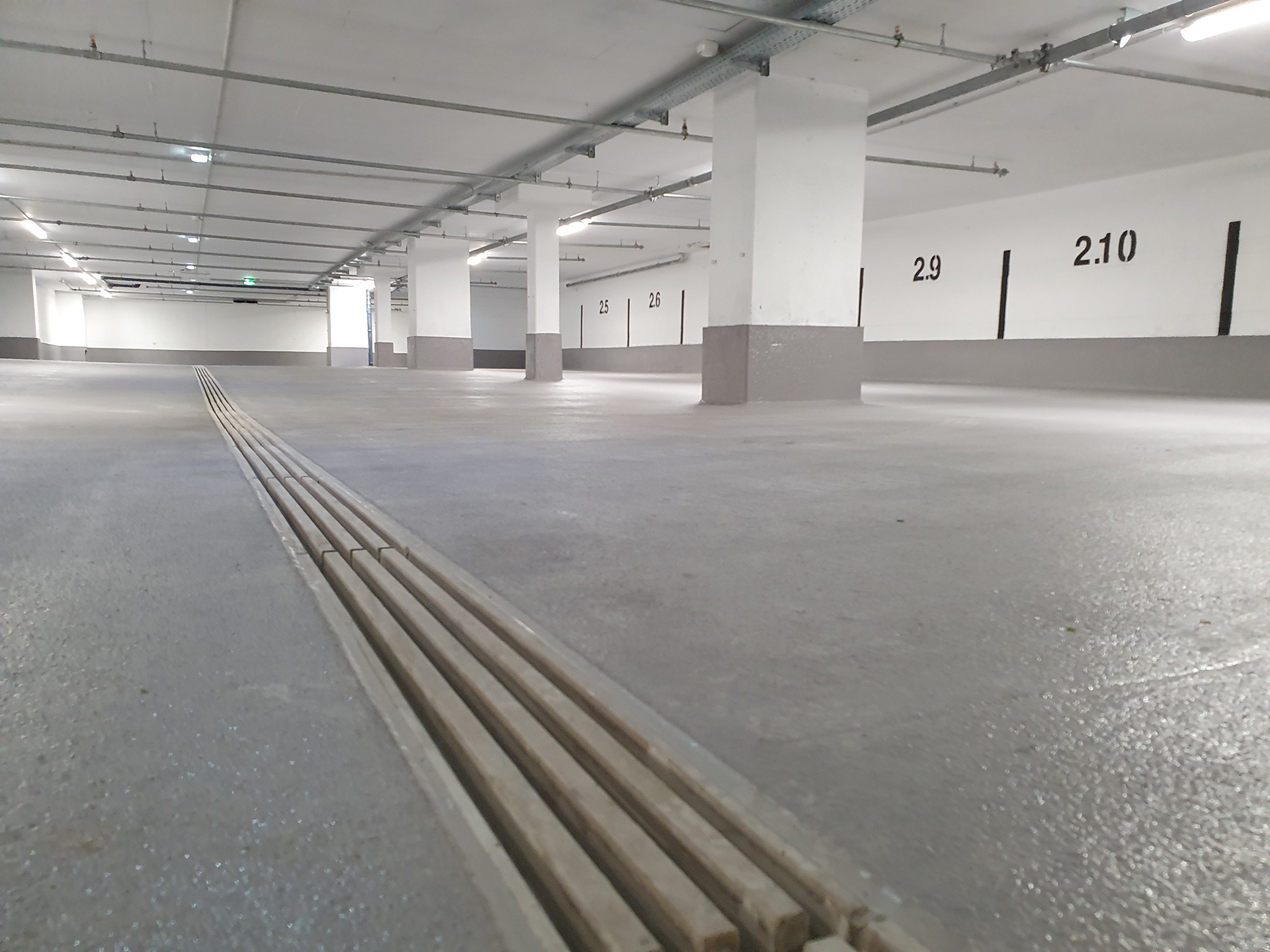 Parallel zu den Hochbaumaßnahmen wurde die zweigeschossige Tiefgarage umfassend saniert. Nach Chloriduntersuchungen erfolgte der Betonabtrag im HochdruckWasserstrahlVerfahren. Die freigelegte Bewehrung wurde gereinigt und je nach Schädigungsgrad ergänzt.