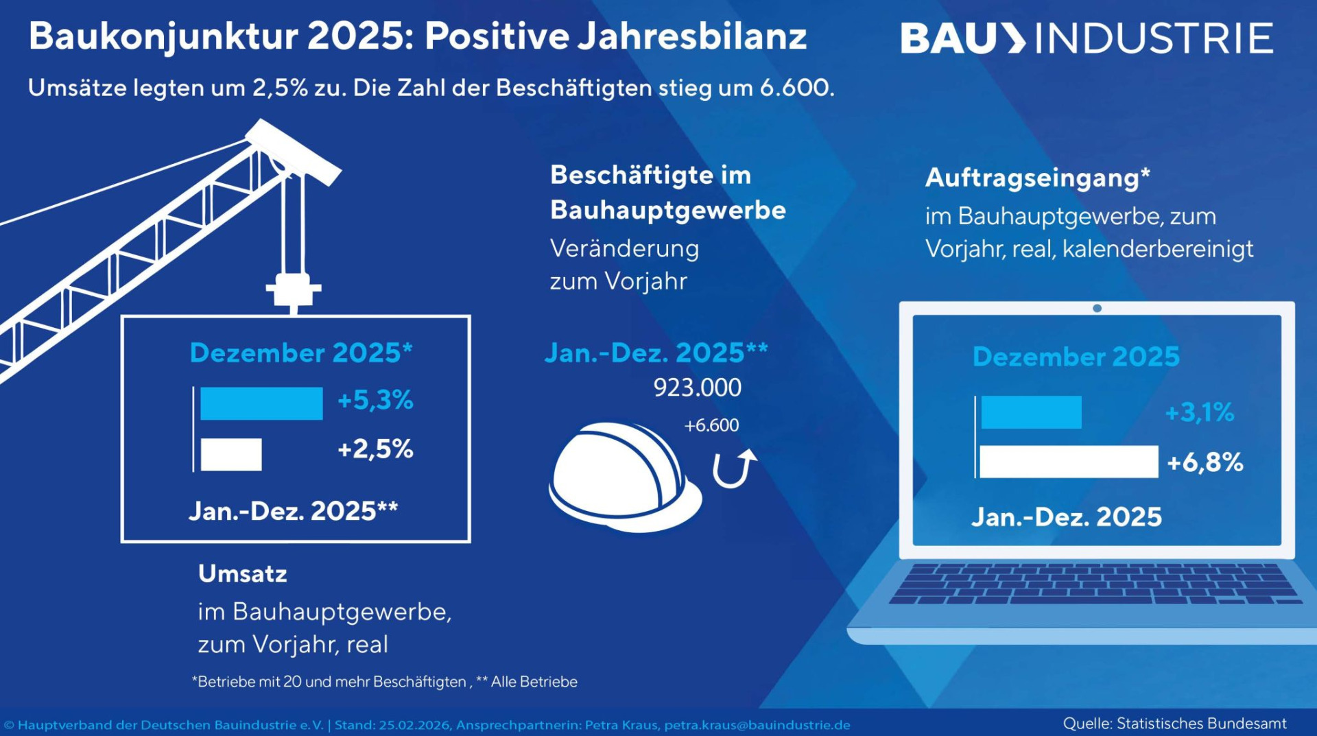 Das Statistische Bundesamt meldete für das deutsche Bauhauptgewerbe1 für den Monat Dezember 2025 im Vergleich zum Vorjahresmonat ein reales Umsatzplus von 5,3 Prozent. Für das Gesamtjahr 2025 ergibt sich für alle Betriebe ein Umsatzplus von preisbereinigt (gerundet) 2,5 Prozent, das ist der erste reale Anstieg seit fünf Jahren. „Damit ist die lange Zeit der Baurezession endlich vorbei. Um die Rückgänge der vergangenen Jahre auszugleichen, reicht es allerdings noch nicht, aber der Anfang ist gemacht. Wir erwarten, dass sich dies auch im laufenden Jahr fortsetzen wird, wir rechnen auch für 2026 mit einem realen Umsatzplus von 2,5 Prozent. Schließlich haben sich die Auftragsbücher wieder ein wenig gefüllt.“ Mit diesen Worten kommentiert der Hauptgeschäftsführer der Bauindustrie, Tim-Oliver Müller, die heute veröffentlichten Konjunkturindikatoren für den Bau.
